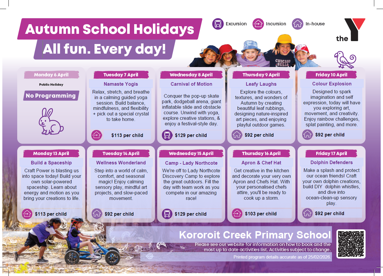 If you would like a local business flyer or local community event to be advertised, please send through an image, PDF or link to our school email address kororoit.creek.ps@education.vic.gov.au.